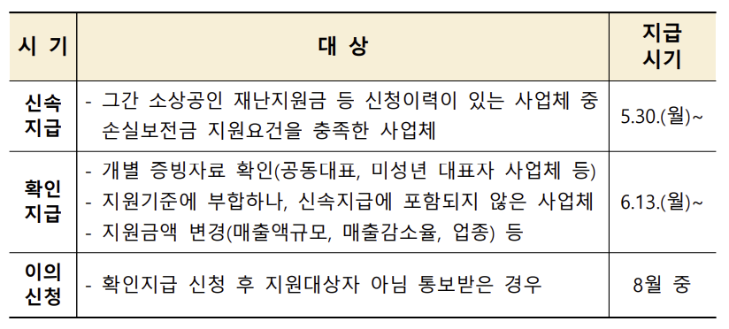 ◆ 대상에 따른 지급시기는 아래 표와 같습니다.