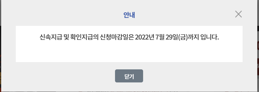 아래와 같이 신속지급 및 확인지급의 신청 마감일은 2022년 7월 29일(금)까지라는 팝업창이 나옵니다.