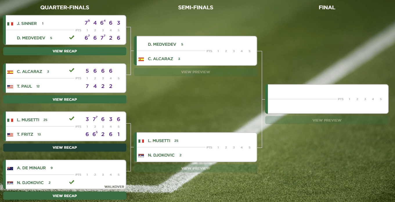 메드베데프와 알카라스, 무세티와 조코비치의 준결승전은 7월 12일 금요일에 진행되고, 대망의 결승전은 대회 마지막날인 7월 14일 일요일에 진행될 예정입니다.