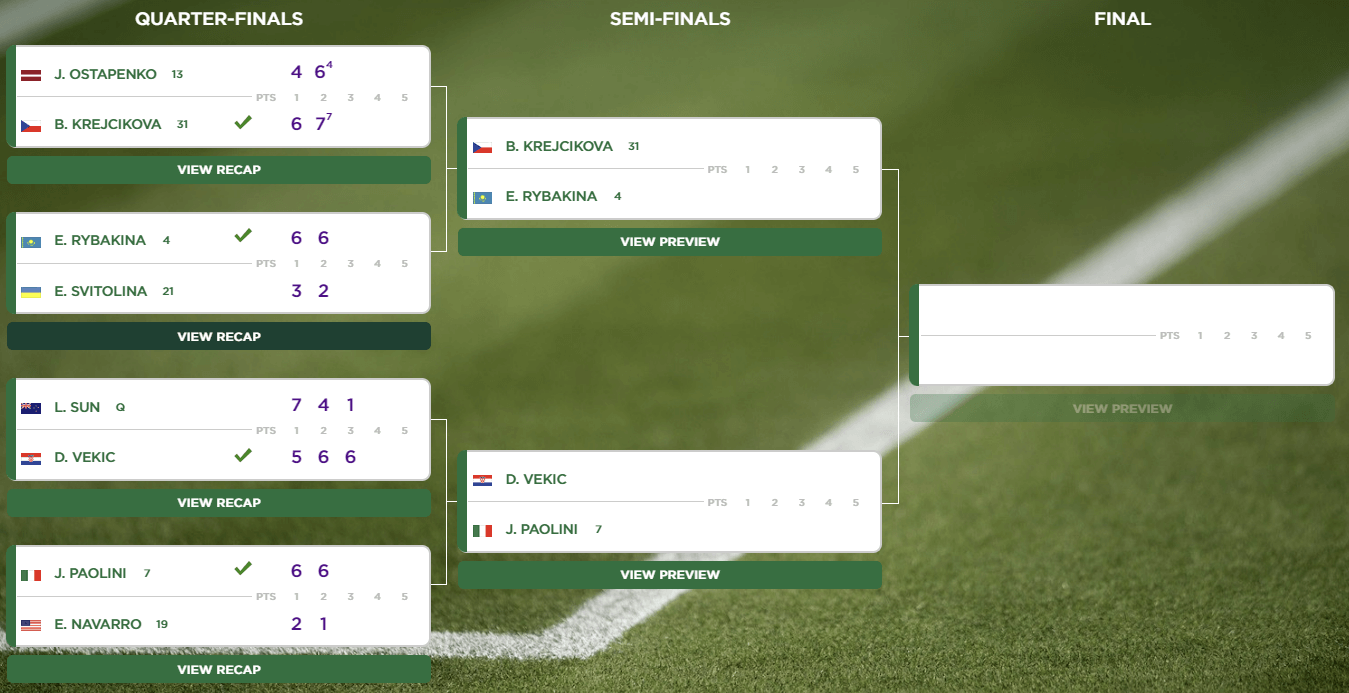 어제 8강 경기에서 뉴질랜드 룰루 선을 이기고 크로아티아 도나 베키치가 4강에 진출했고, 미국의 엠마 나바로 선수를 이기고 랭킹 7위 자스민 파올리니가 4강, 준결승전에 진출했습니다.